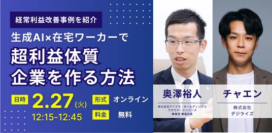 【2月27日(火)12:15~12:45】株式会社アイドマ・ホールディングス、株式会社デジライズ共催 生成AI×在宅ワーカーで超利益体質の会社を作る方法についての無料セミナー開催決定