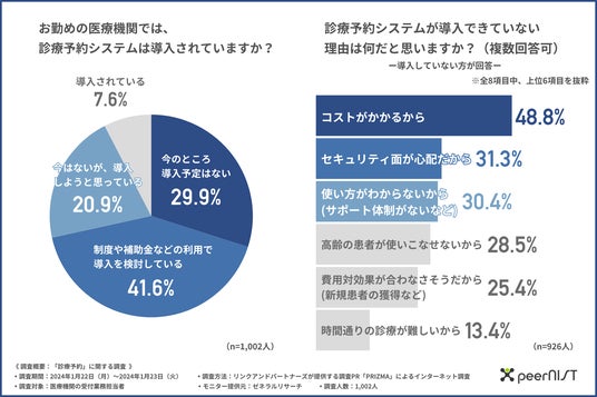 「お勤めの医療機関では、診療予約システムは導入されていますか?」と質問したところ、『今のところ導入予定はない(29.9%)』『制度や補助金などの利用で導入を検討している(41.6%)』『今はないが、導入しようと思っている(20.9%)』『導入されている(7.6%)』という回答結果になりました。9割以上の方が、まだお勤め先で診療予約システムが導入されていないようです。ここからは、お勤め先で診療予約システムを導入していない方にうかがっていきます。「診療予約システムが導入できていない理由は何だと思いますか?(複数回答可)」と質問したところ、『コストがかかるから(48.8%)』と回答した方が最も多く、次いで『セキュリティ面が心配だから(31.3%)』『使い方がわからないから(サポート体制がないなど)(30.4%)』『高齢の患者が使いこなせないから(28.5%)』『費用対効果が合わなさそうだから(新規患者の獲得など)(25.4%)』『時間通りの診療が難しいから(13.4%)』と続きました。半数近くの方が『コストがかかるから』と回答したことから、診療予約システムを導入するにあたってあまり予算がとれない医療機関が多いのかもしれません。では、診察予約システムの導入でどのようなメリットが期待出来ると思っているのでしょうか?また、システムを利用している方にとっては、どのようなことがメリットであると感じているのでしょうか。続きは下記サイトでご紹介をしております。