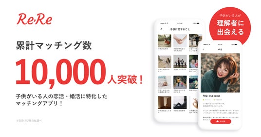 株式会社ReReは、2021年4月19日にリリースした、「子供がいる方」と「子供がいる人との出会いを希望する方」をつなげるマッチングアプリ『ReRe』に関して、累計マッチング数が10,000件を突破したことをご報告いたします。