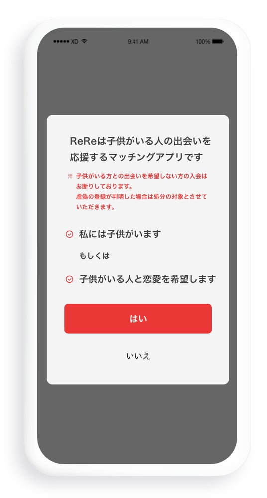 子供がいる人向け恋愛アプリ「ReRe」について、『シングルマザー・シングルファザー限定』という記載はお控えいただくようお願いいたします。