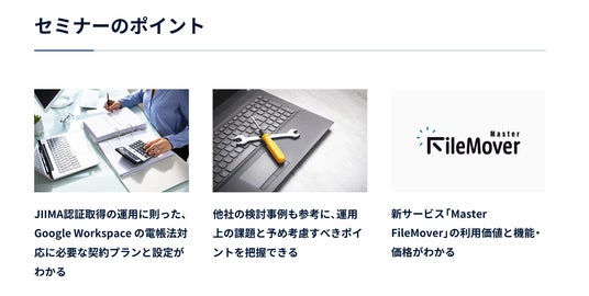 また、Google Workspace による電帳法対応を検討する企業のニーズを基に独自開発した、新サービス「Master FileMover」の概要や導入メリットをご紹介します。