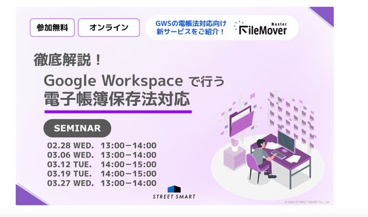 企業や教育機関のDXを支援する株式会社ストリートスマート(所在地:大阪府大阪市北区、代表取締役社長:森田竜次、以下:ストリートスマート)は、Google Workspace で行う電子帳簿保存法対応(以下、電帳法)の無料セミナーを開催します。