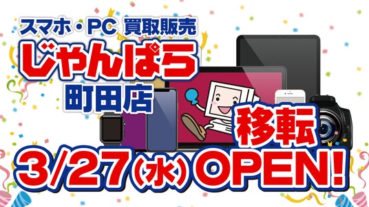 スマホ・パソコンの買取・販売「じゃんぱら」は、「じゃんぱら町田店」を移転し、2024年3月27日(水)にリニューアルオープンいたします。