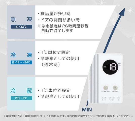 ※環境温度25℃、環境湿度50% ※上記は目安です。庫内の食品量やお好みに合わせて調整をして下さい。