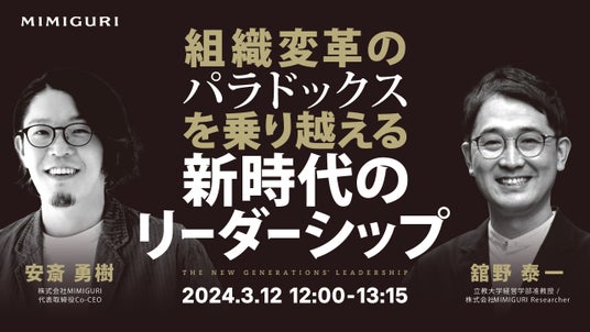株式会社MIMIGURI(本社: 東京都文京区 代表取締役:安斎勇樹・ミナベトモミ、以下MIMIGURI)は、安斎勇樹・舘野泰一(『パラドックス思考』共著者)による無料オンラインセミナー『組織変革のパラドックスを乗り越える「新時代のリーダーシップ」』を2024年3月12日(火)12:00~13:15に開催いたします。