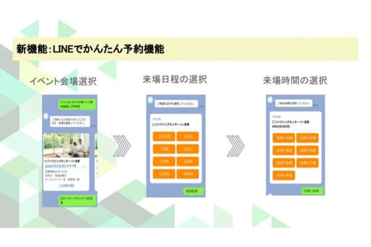 こうした反響獲得の伸び悩みを解決するための機能として、新機能「LINEでかんたん予約機能」を追加リリースいたしました。この新機能では、LINEのトーク画面上でイベント情報を受け取ったエンドユーザーは、そこから別ページへ遷移しなくても、そのまま簡単に来場予約を行うことが可能です。予約完了までのステップが格段に減ることで利便性が向上し、効率的かつ気軽に来場予約ができるようになります。