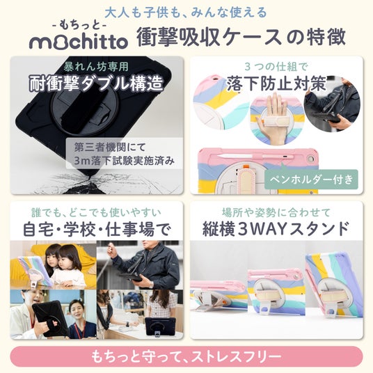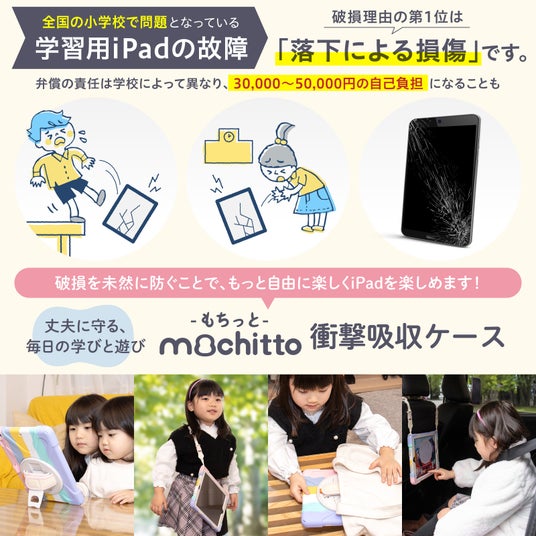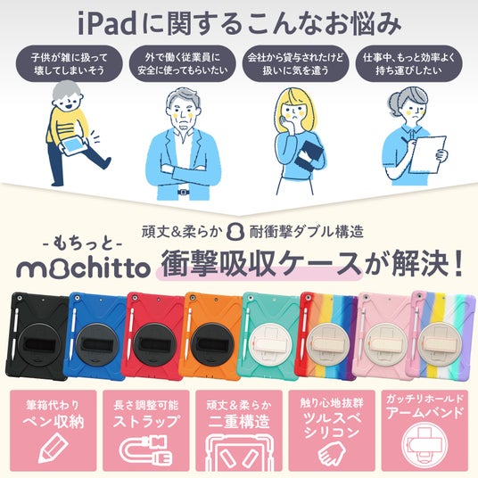 「雑に扱って壊しそう…」学校や建設現場でiPad10.2を守る【mochitto-もちっと- 耐衝撃ケース】新発売!子供も大人も使いやすいカラバリ、頑丈なダブル構造と3つの落下防止対策でリスクを軽減