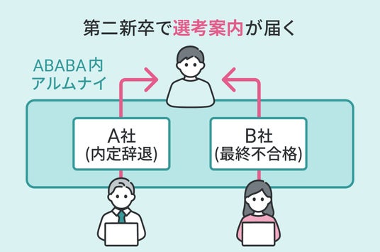 「ABABAアルムナイ(アバクル)」は、繋ぎとメールを通して、過去に自社の最終面接まで行った人材、特に内定辞退者がABABA上の採用コミュニティ「アバクル」に登録し、第二新卒および中途採用の機会に企業がスカウトを送ることができるサービスです。