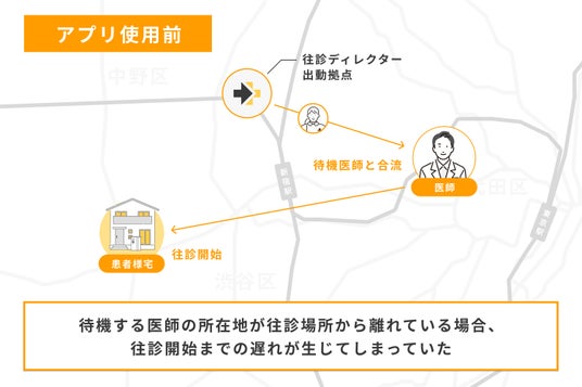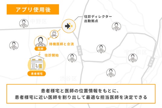 これまでのオペレーションでは、往診依頼の受け付け後、訪問先の患者様宅(施設含む)と待機医師の所在地問わず、コールセンターから待機医師へ出動要請を出し、往診対応を行なっていましたが、本アプリの場合では、患者様宅と医師の位置情報をもとに、患者様宅に近い医師を割り出して最適な担当医師を決定できるため、往診までにかかる対応時間の大幅な短縮に成功しました。
