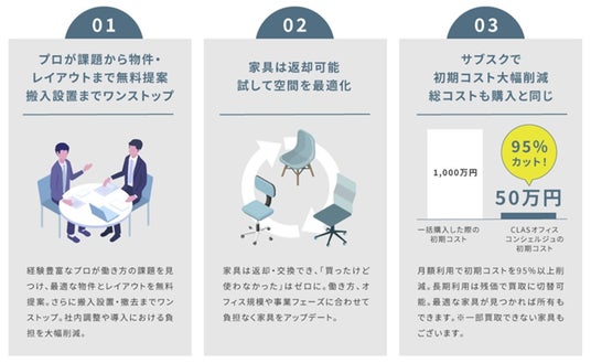 持たない、捨てない社会をつくる株式会社クラス(本社:東京都目黒区、代表取締役社長:久保 裕丈)が運営する、法人向けオフィス家具のレンタル・サブスク「CLAS BUSINESS」(https://clas.style/biz)にて、会社の働き方の課題を紐解き、それらに基づく最適な物件を無料でご紹介し、レイアウトと家具を選定した上、搬入設置までワンストップで対応する、「CLASオフィスコンシェルジュ」を2024年2月22日より提供開始いたします。