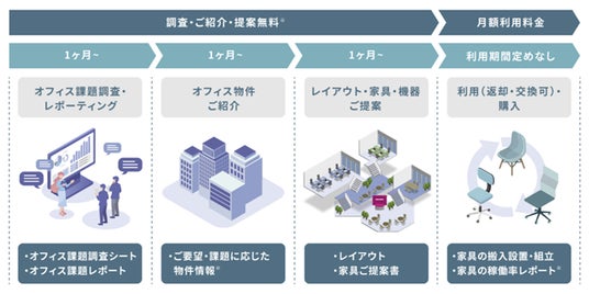 「CLASオフィスコンシェルジュ」は、あなたの会社の働き方の課題を紐解き、それらに基づく最適な物件を無料でご紹介。さらに、レイアウトと家具を選定し、搬入設置までワンストップで対応します。