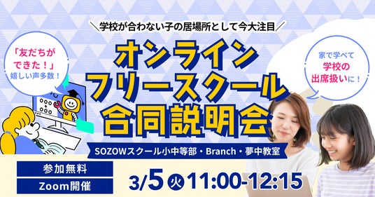 ITツールの活用によって都市部から過疎地・離島まで全国の子どもに学びの機会を届けているオンラインフリースクールによる合同説明会を、3月5日(火)にオンラインで保護者向けに開催します。(主催:SOZOW株式会社、協力:NPO法人全国不登校新聞社)