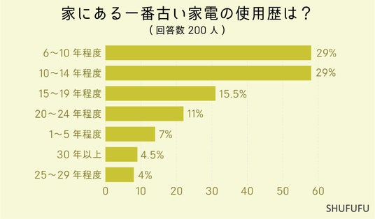 家にある一番古い家電の使用歴は?の問いに対して最も多かったのが「6~10年程度(29%)」でした。 次いで「10~14年程度(29%)」「15~19年程度(15.5%)」という結果でした。 30年以上と答えた人は「4.5%」いました。5年以上家電を使用する方が多数派のようです。