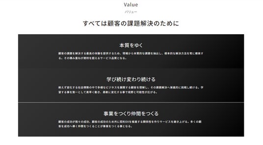 学び続け変わり続ける :絶えず変化する社会情勢の中で多様なビジネスを展開する顧客を理解し、その課題解決へ漸進的に挑戦し続ける。学習する事を第一として素早く動き、柔軟に変化する事で視野と可能性が広がる。