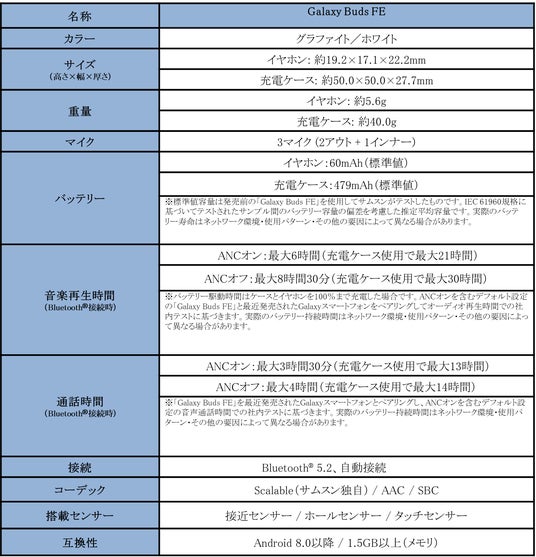 ※1 現在Samsungオンラインショップ・Galaxy Harajuku・Amazon・主要EC サイト・家電量販店で販売中の「Galaxy Buds FE」と同一の製品です。※2 一部非取扱い店舗がございます。※3 「Galaxy Buds」シリーズはGalaxy端末以外でも使用可能(Bluetooth接続)です。ただし、iOS端末では「Galaxy Wearable」アプリの使用・イヤホンの細かな設定はできません。一度Android端末で設定した後にiOS端末でご使用いただくと、イヤホン側での操作は可能となります。
