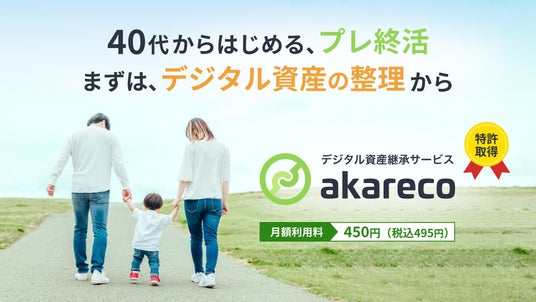 akarecoはスマホやPCのパスワード、ネットバンクや暗号資産などのアカウント情報、サブスク契約情報などを入力・管理し、死亡や脳死判定、認知症判定などの際に指定した継承者にだけその情報を開示するサービスです。