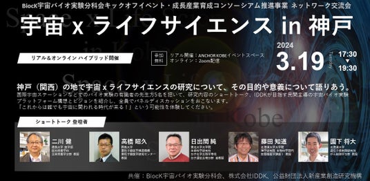 株式会社IDDK(本社:東京都江東区、代表:上野 宗一郎)は、2024年1月に神戸医療産業都市に進出し、バイオラボ機能を新設しました。これを契機に内閣府認定グローバルバイオコミュニティの一つ、バイオコミュニティ関西(BiocK)より設立の承認を受けていた「宇宙バイオ実験分科会」の活動を本格的に開始。キックオフイベントとして宇宙バイオ実験の有識者の先生方5名をゲストに迎え、神戸(関西)の地で宇宙xライフサイエンスの研究について、その目的や意義について語り合うイベントを開催します。