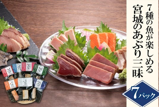 世界でも有数の漁場として名を馳せる三陸の栄養豊富な海で獲れた7種の魚をさっとあぶって香ばしく仕上げました。解凍して切るだけでお刺身、お寿司、サラダなどをお楽しみいただけます。
