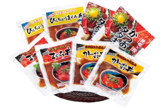 かつおやまぐろを枕崎産のかつお節と北海道産の昆布でだしを取ったタレに漬け込みました。解凍してご飯に乗せるだけの簡単調理で、4種の味を食べ比べできるセットです。