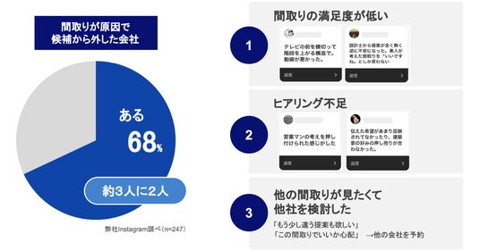 当社の独自調査(※1)で、68%もの方が間取りを原因に候補から外したことがあると回答がありました。除外理由も併せて聞いたところ、1.間取り自体の満足度が低い2.ヒアリング不足3.他社を検討した、の3つが主な原因となり失注につながっていました。