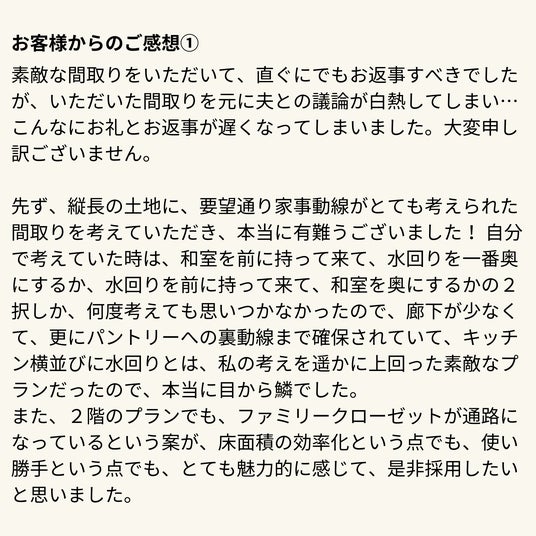 弊社のC向けサービスmadree(マドリー)では、注文住宅を検討中の一般消費者様よりご依頼をいただき、マドリー登録の建築家が間取りを作成・提案しています。お客様の拘りポイントやトレンドを反映したものが多く、満足度は80%以上。選ばれる間取りを「madreeデータバンク」に掲載しています。