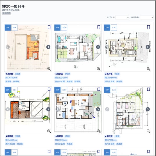 【主な検索項目】●土地の特徴による検索 ex)狭小地や傾斜地などの特徴/道路付き方位など●建物についての検索 ex)延床坪数/間口・奥行/玄関方位/nLDKなど ●施主のこだわりについての検索 ex)2WAY玄関/ヌック/インナーバルコニー/玄関直結パントリーなど