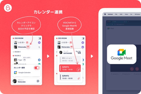 Googleカレンダーとの連携により、VOICHATからGoogle Meetを起動したり、チームメンバーの予定を確認したりできるようになります。