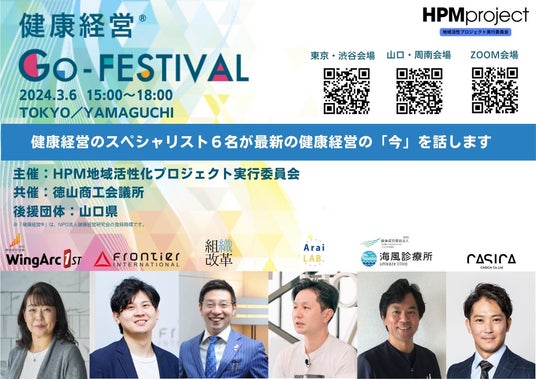 HPM地域活性化プロジェクト実行委員会を運営する株式会社CASICA(本社:東京都港区/代表取締役:森脇剛)は、日本で初めてとなる、東京と山口県の会場をオンラインで中継しながら組織のエンゲージメントが上がるイベント『健康経営Go-FESTIVAL』を3月6日初めて開催いたします。