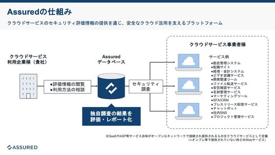Assuredは、SaaS/ASPなどのクラウドサービスの安全性を可視化するプラットフォームです。専門知識を有するセキュリティ評価チームが、主要なガイドラインやフレームワークに基づき、クラウドサービスのセキュリティ対策状況を調査し、その評価結果をデータベースに集約することで、効率的かつ高精度なセキュリティ評価を実現します。また、クラウドサービス事業者は、Assuredによるセキュリティ評価情報を用いて自社サービスの安全性を示すことができ、利用企業・事業者双方を繋ぐ役割として、企業の安全なクラウド活用、そして社会全体のDX推進を支えます。