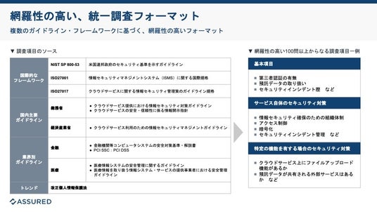 また、FISC安全対策基準など、金融機関として準拠すべきガイドライン改定等、世の中のトレンドに合わせてセキュリティチェックシートの項目内容を見直していく必要もあります。そうした変化に随時対応しながら、客観的かつ網羅的な確認項目でアセスメントをしていく効果的な方法を模索していたなか、Assuredを知り、導入を決定しました。
