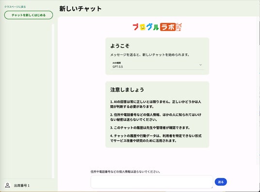 「みんなで生成AIコース」では、児童・生徒が安心して生成AIを使うことができます。授業での使用を想定し、先生が児童・生徒のアクセス管理を行い、注意事項を表示する機能も備えています。Microsoft Azure OpenAIのAPIを利用し、個人情報の保護を重視した環境で、安全かつ創造的な学習環境を実現しています。なお、本コースのご利用には、事前申し込みが必要です。