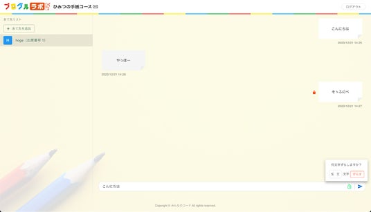 「ひみつの手紙コース」では、ネット上でメッセージの暗号化と復号化を行いながら、暗号化の基本とプライバシーの重要性を学びます。
