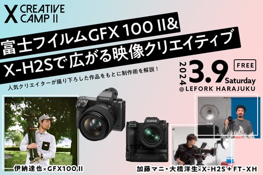 加藤さんと大橋さんには、3月9日(土)に開催するイベント「X CREATIVE CAMP II」(イベント詳細は下記参照)にて、X-H2SとFT-XHを活用したミュージックビデオの撮影の裏側とミュージックビデオの制作フロー、実際に作品制作を通じて感じたX-H2SやXレンズ、マルチレック機能の魅力などについてお話いただきます。