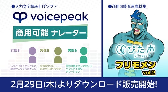 『VOICEPEAK 商用可能 ナレーター』女性5/男性5/男性6、ぴた声 フリモメン vol.2、ダウンロード販売開始!