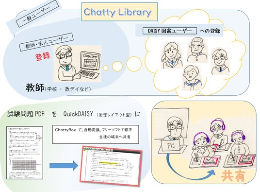 さらに、ChattyBox のファイル共有機能を活用して、教師が作成した試験問題を、生徒のパソコンやタブレットなどで共有することが可能です。詳しくはChatty Libraryのサイトの「PDF→DAISY」のページ (https://chattylib.com/library/about/pdf-to-daisy) をご覧ください。