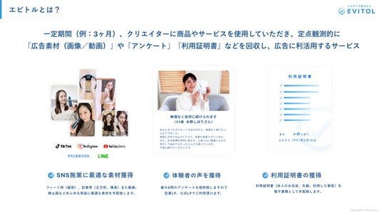エビトルは、広告で紹介する商品に関して、実際の商品利用に基づくエビデンスを獲得できるサービスです。
