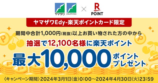 2024年1月26日(金)より「ヤマザワ」「ドラッグヤマザワ」の全店にて「ヤマザワ Edy-楽天ポイントカード」の配布を開始しました。導入を記念して、2024年3月1日(金)から4月30日(火)まで、「ヤマザワ・ドラッグヤマザワで条件達成すると抽選で最大10,000ポイントプレゼント」キャンペーンを実施します。キャンペーン期間中に、「ヤマザワ」「ドラッグヤマザワ」で「ヤマザワ Edy-楽天ポイントカード」を提示して期間中合計1,000円(税抜)以上のお買い物をした方の中から抽選で12,100名に最大10,000ポイント進呈します。