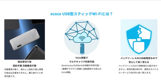 株式会社Lieferantは、契約・月額費用不要、端末買切り型のUSB型スティックWi-Fi「ecoco」の販売を開始したことをお知らせいたします。バッテリーレスの新型端末で安全にご利用いただけます。