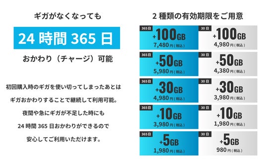 急にギガが足りなくなった時も24時間365日おかわりができるので安心してご利用いただけます。
