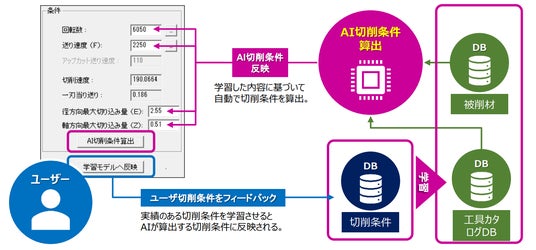 本機能では、AI技術の「データマイニング手法」を使い工具メーカーの大量な工具・切削条件や工具カタログデータに登録されていない被削材の材料物性値などを学習させることで、ユーザーが選定した被削材や工具に対し、学習後の切削条件を自動算出することが可能となります。また、加工実績に基づくユーザー独自の切削条件をデータベース(DB)にフィードバックするため、機械学習で効率化された加工情報資産の構築が可能となり、これらAI活用によりユーザー企業が抱える課題を解決します。