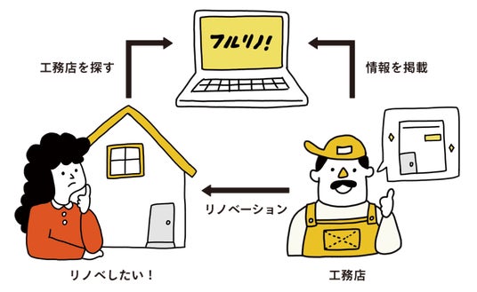 「フルリノ!」は、日本に数あるリノベーション事業者の中から、特に高品質で優良な事業者の情報を集約したポータルサイトです。その中から、リノベーションをしたい人が自由に工務店を探し、依頼や問い合わせをすることができます。
