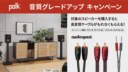 Polk Audioは昨年日本の皆様に予測を大きく超える特別なご愛顧をいただきました。そのお気持ちに感謝し、2024年3月1日(金)より「Polk Audio 音質グレードアップキャンペーン」を実施いたします。2024年3月1日(金)から2024年6月30日(日)までのキャンペーン対象購入期間中にPolk Audioの「Reserveシリーズ」または「Signature Eliteシリーズ」のステレオスピーカーをご購入の上、キャンペーンにご応募いただいた方全員にAudioQuestの高音質スピーカーケーブル、またはオーディオケーブルをプレゼントいたします。