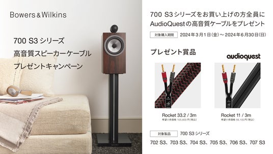 対象購入期間中に700 S3シリーズのステレオスピーカー(1組)をご購入の上、ご応募いただいた方全員に、700 S3シリーズにベストマッチなAudioQuestの高音質スピーカーケーブル「Rocketシリーズ」の「Rocket 33.2」または「Rocket 11」(3m / ペア / シングルバイワイヤ / 金メッキバナナプラグ仕様)をプレゼントいたします。応募条件