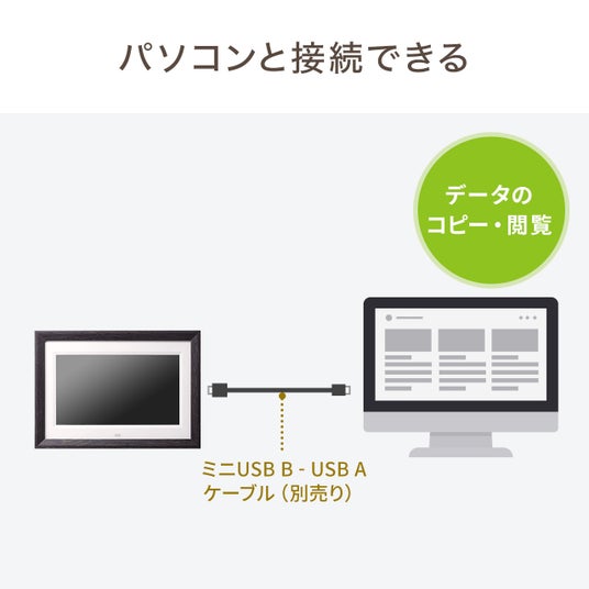 本製品とパソコンを別売りのminiUSB-USB Aケーブルで接続し、データのコピーや閲覧をすることができます。