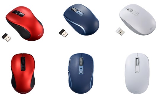 「無線/Bluetooth 静音5ボタンBlueLEDマウス」は静音ボタン仕様で静かな環境下でも使いやすいBlueLEDマウスです。それぞれサイズ・重さにフォーカスした3種計24品番をラインアップしました。
