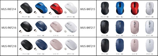 MUS-RKF214、MUS-BKF215は、約67g(電池は含まず)で、指の形に添った三次曲面が手にフィットする軽量マウスです。カラーラインアップはブラック(BK)、ブルー(BL)、レッド(R)、ホワイト(W)のスタイリッシュな4色を揃えました。