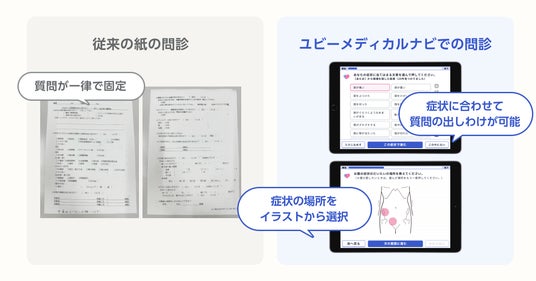 「ユビーメディカルナビ」は診療の質向上を支援する医療機関向けサービスパッケージです。問診業務効率化を図る「ユビーAI問診」や、認知向上をサポートする「ユビーリンク」などを提供しています。「ユビーAI問診」は紙の問診票のかわりにスマートフォンやタブレットを活用した、医療機関の業務効率化を支える問診サービスです。医師は文章に翻訳された問診内容と病名辞書の結果を活用することで、電子カルテ記載に伴う事務作業が大幅に削減されます。結果として、より患者さんに向き合う時間が増え、診察等の医師にしかできない業務により集中していただけるようになります。2024年1月時点で、病院・クリニック合わせて全国47都道府県・1,700以上の医療機関で導入されています。第三回日本サービス大賞で「厚生労働大臣賞」と「審査員特別賞」を受賞しました。