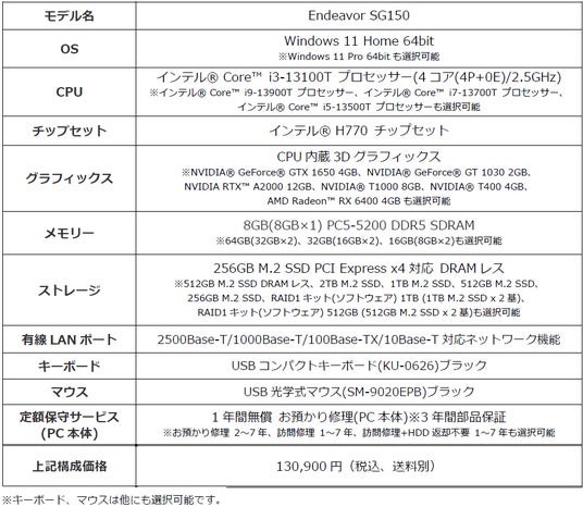 エプソングループのエプソンダイレクト株式会社(本社:長野県塩尻市、社長:一杉卓志)は、容積約2.8リットルのコンパクトな筐体にグラフィックスボードが搭載可能な高性能デスクトップパソコン『Endeavor SG150』を発売し、オンラインショッピングサイト(https://shop.epson.jp/)とコールセンター[ご購入相談およびご注文窓口](電話0120-545-101<通話料無料>)を通じて、3月5日より受注を開始しました。