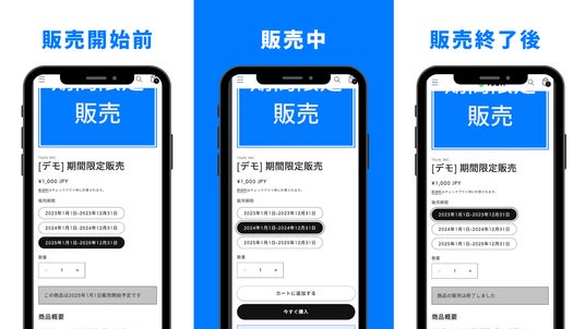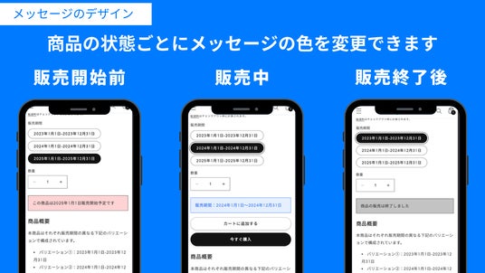 商品が販売期間外の時はカートボタンを自動で非表示にし、販売期間中のときは自動で表示します。また、販売前や販売中、販売後で任意の商品メッセージを表示でき、デザインも自由にカスタマイズすることができます。