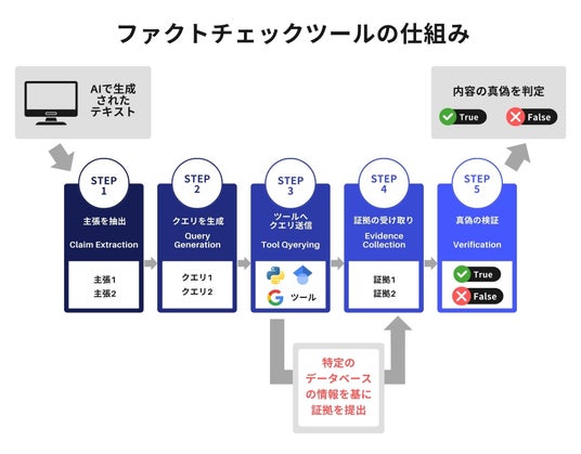 AI総合研究所として活動するNABLAS株式会社 (本社 : 東京都文京区本郷、 代表取締役 所長 : 中山 浩太郎、 以下「当社」)は、ChatGPTなどのAIによって生成されたものかどうかに関わらず、テキスト情報の正誤を判定するファクトチェックツールの提供を開始しました。このファクトチェックツールは、インターネットや社内のデータベースを参照し、それらの情報範囲の中から、該当のテキスト情報に関する根拠を取得し、情報の真偽をチェックします。これにより、テキスト情報の真偽判断が可能になるだけでなく、チャットボットやChatGPTなどの生成AIをビジネスで活用する中で、AIが誤った情報を出力するハルシネーションへの対策として、より生成AIの信頼性を高める事が可能となります。